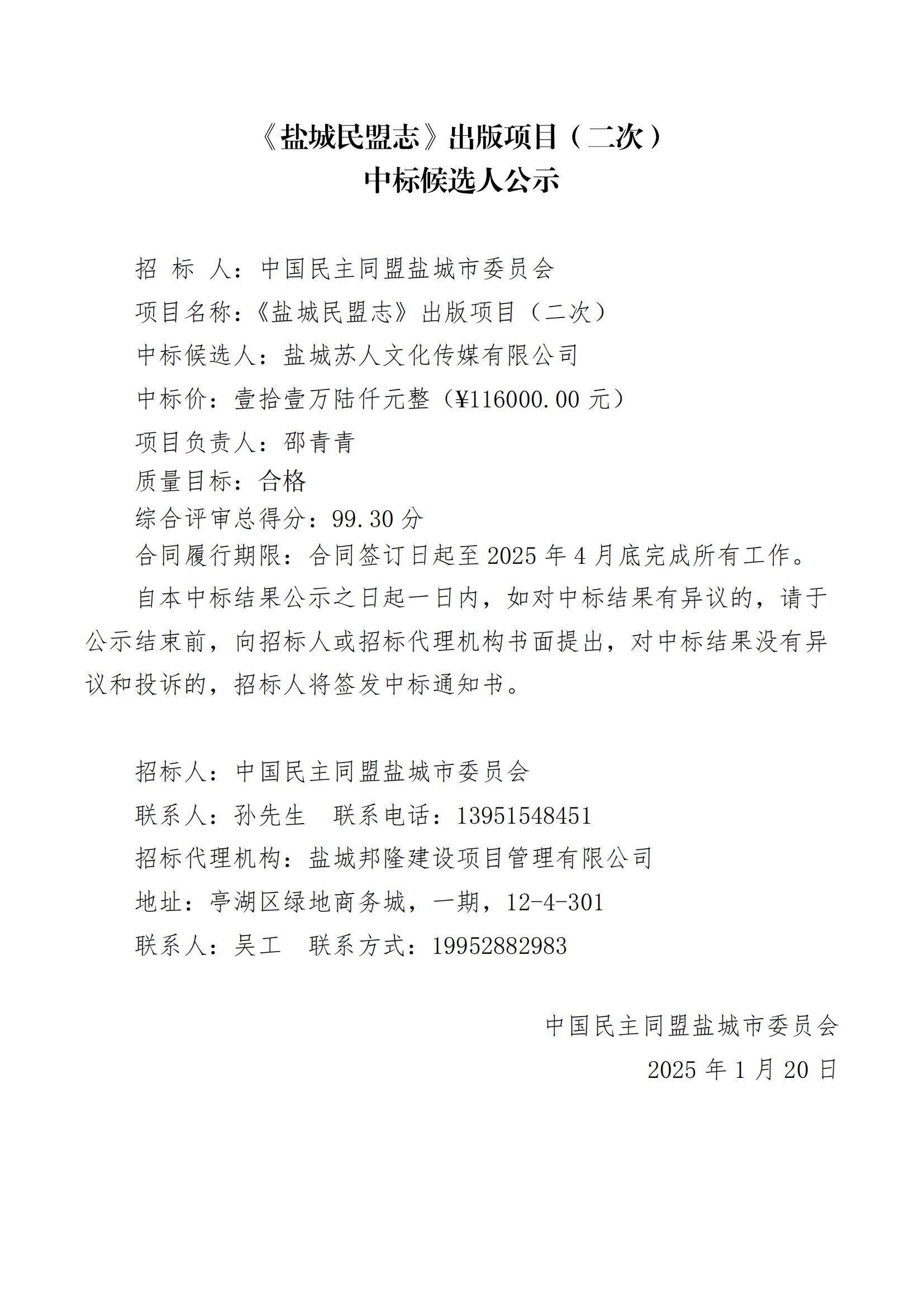 《盐城民盟志》出版项目(二次)中标候选人公示